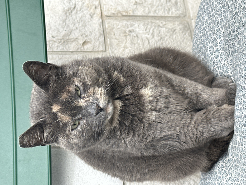 - "A dilute tortoiseshell domestic cat with blue-grey and cream/fawn fur sits upright, facing forward, with its front paws tucked beneath its body" by FM-R99HH2, licensed under CC BY 4.0