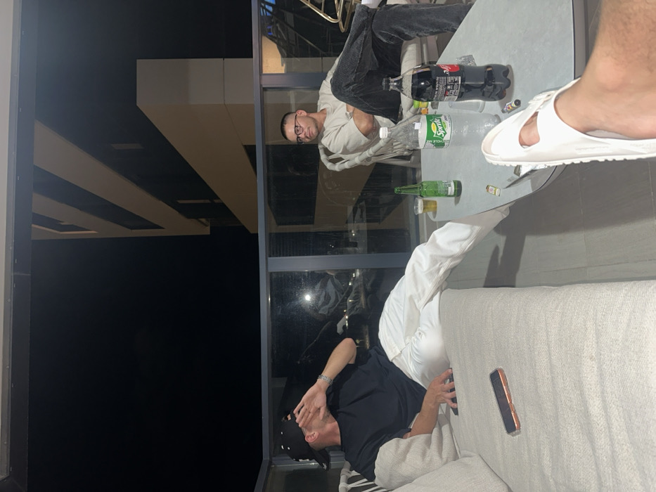 The image captures a nighttime scene on an outdoor balcony or terrace in Bat Yam, Israel. Two adult males are visible, seated, while a third individual's foot is present in the foreground. To the left, a male subject is seated on a light-colored outdoor sofa. He wears a black t-shirt, white trousers, and a black baseball cap worn backward. His left hand is raised, partially obscuring his face. A smartphone in a clear case rests on the sofa beside him. To the right, a second male subject is seated in a light-colored wicker-style outdoor chair. He wears a light-colored t-shirt and dark trousers, and glasses. His arms are crossed over his chest, and he is looking towards the left. In the lower foreground, the right foot of a third individual, wearing a white slide sandal, is partially visible. Between the two seated males is a light-grey rectangular coffee table. On the table, from left to right, are a green glass beer bottle with a clear glass containing beer, a large clear plastic bottle of Sprite, an empty clear plastic bottle, and a large black plastic Coca-Cola bottle bearing Hebrew text. Two small rectangular lighters, one red and one green, are also on the table, along with a small white container or cup. The balcony is enclosed by a glass and dark grey metal railing. Beyond the railing, a modern building with light-colored facades and dark windows is discernible against a dark night sky. The scene is illuminated by artificial light sources from the balcony area.