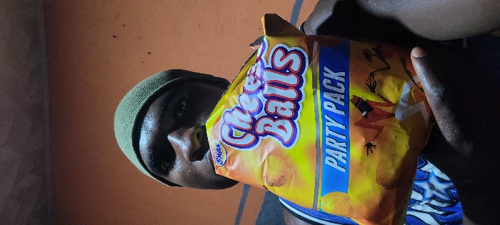 - "A man with a beanie is looking directly at the camera while holding a large bag of "Cheez Balls Party Pack" by FM-wmVIJ2, licensed under CC BY 4.0