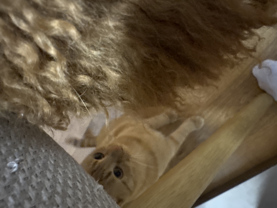 The scene is an indoor domestic environment, possibly located in Sofia, Bulgaria, featuring light wooden flooring. An orange tabby cat with striped markings on its head and amber eyes is positioned on the light wooden floor, looking directly towards the viewer with dilated pupils. Its front paws are visible beneath its chest. To the right, a significant portion of the frame is occupied by a large mass of curly, light brown fur, indicative of another animal, likely a dog. A human foot, encased in a white sock, is partially visible at the bottom right corner, adjacent to the furry animal. In the upper left quadrant, a light gray, textured fabric, consistent with furniture upholstery, partially obscures the background. Below this fabric, a light wooden furniture leg extends vertically downwards. The cat appears to be situated near or partially concealed by a piece of furniture.