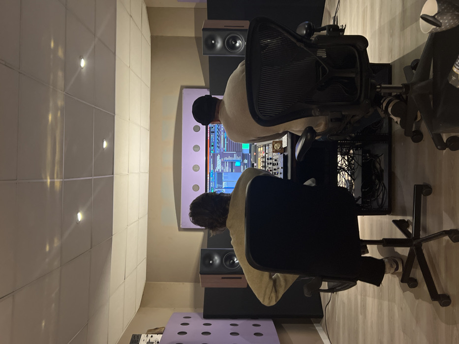 An interior view of an audio recording studio or control room in Aubervilliers, France, displays two individuals seated in office chairs, facing a large computer monitor and audio equipment