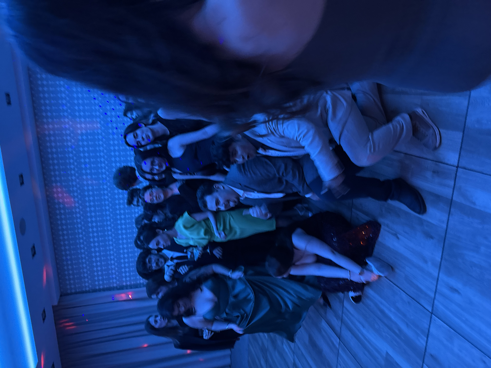 A group of approximately 13 people are lying on the floor in a crowded indoor space, possibly a dance floor, illuminated by blue lighting