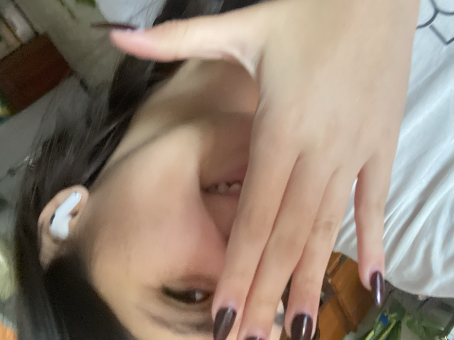 The scene depicts a close-up, angled view of a single individual in an indoor environment. The subject, of indeterminate age and gender, has dark hair and is wearing a white garment, likely a t-shirt. A white wireless earbud is visible in the subject's left ear. The subject's left hand is positioned across the lower portion of their face, partially obscuring the nose and mouth, though a portion of the mouth revealing teeth consistent with a smile is visible beneath the hand. The left eye is also visible, looking towards the camera. The fingernails on the visible hand are painted a dark, possibly maroon or deep brown, color and appear to be manicured with an oval or almond shape. The background is out of focus, showing indistinct shapes and muted colors, consistent with an interior residential setting, possibly including wooden furniture on the left side of the frame. No specific street or building identifiers are visible to pinpoint a precise location within the city of Cotoperíz, Venezuela, beyond the general indoor, residential-type setting.