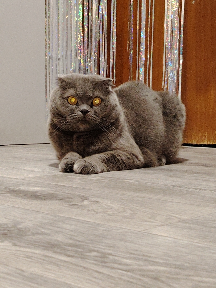 A gray Scottish Fold cat sits on a gray wood-look floor. Its paws are neatly tucked under its chest. The cat's eyes glow yellow, contrasting with its gray fur. Behind the cat is a backdrop of silver tinsel strips, along with a white wall and brown curtains. The cat's focused gaze captures the viewer's attention, highlighting its distinctive folded ears.