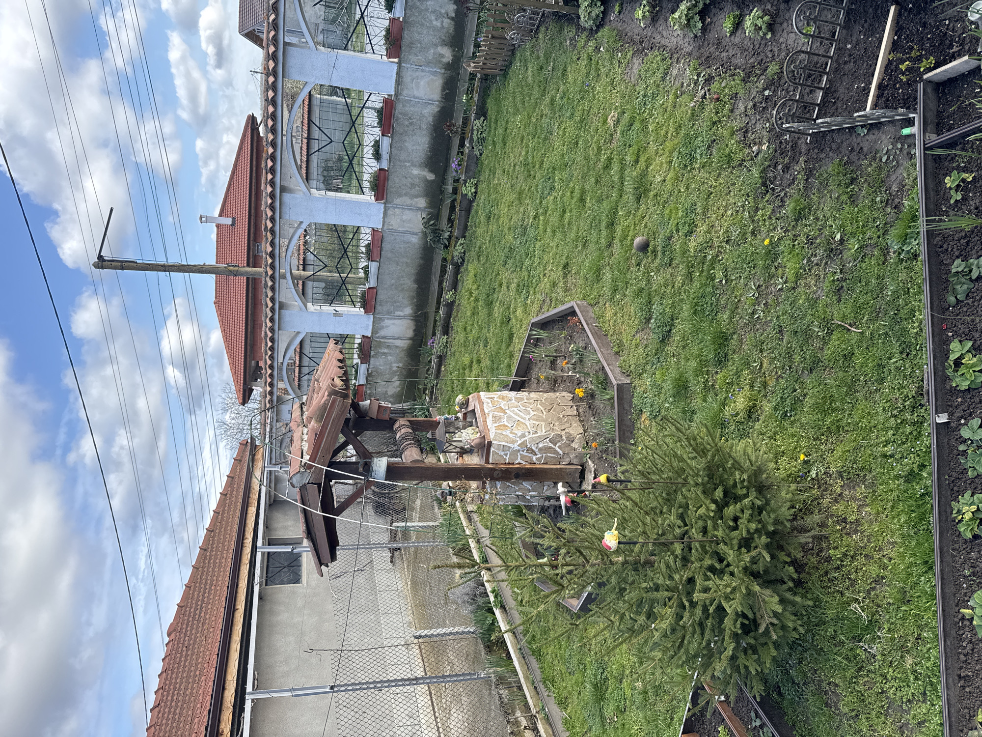 The image displays a residential backyard or garden located in Strashimirovo, Bulgaria, under a bright, partly cloudy sky. No individuals are present in the scene. In the immediate foreground, several raised garden beds with dark soil contain sparse young green plants, some appearing to be onions or similar small shoots, and others possibly strawberries. To the left, a dense, conical evergreen shrub, approximately 0.75 meters tall, is adorned with two decorative, bird-shaped garden stakes (one yellow/red, one yellow/orange). A small section of green grass occupies the mid-foreground, featuring a single dark, spherical object, possibly a bocce ball. On the far right, a short, dark-colored ornamental metal fence separates a patch of tilled earth. The central midground is dominated by a decorative well structure. It features a stone-clad circular base, approximately 1 meter in height, supporting a dark wooden framework with a small, gabled roof of reddish-brown tiles. The base of the well holds a dark metal lantern and several small figurines. The well is encircled by a hexagonal wooden border, within which dark soil contains small blooming plants, including yellow daffodils and purple primroses. Behind the well, a low concrete wall supports a white ornamental fence structure featuring a series of arches and dark decorative ironwork, topped with several small red terracotta planters containing green plants. Beyond this fence, a residential building with a prominent red tiled roof and a white chimney is visible. Overhead power lines traverse the upper portion of the frame. On the right, a utility pole with an attached street light arm stands against the sky. On the left side of the scene, a chain-link fence separates the depicted garden from an adjacent property. This neighboring property features a light-colored stucco or concrete wall and a reddish-brown tiled roof. The ground throughout the garden consists primarily of green grass with patches of bare soil and weeds, indicating early spring or late winter conditions.