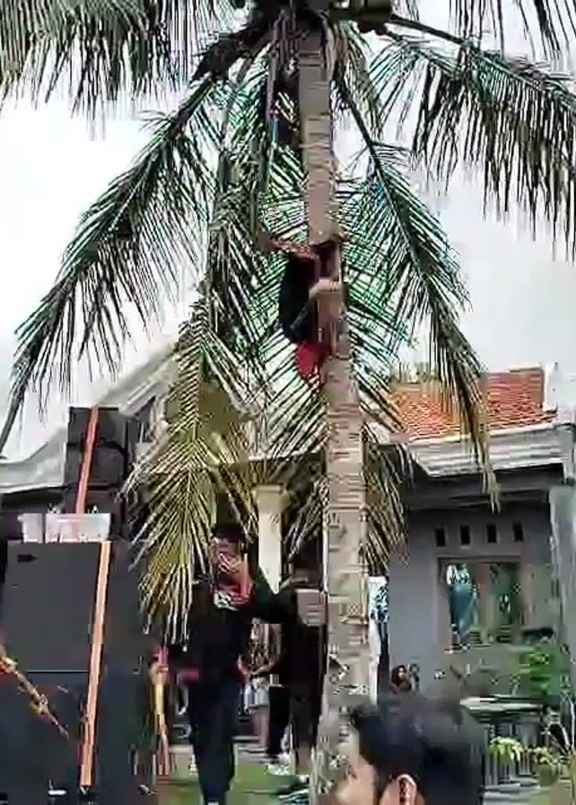 person climbing a coconut tree in front of a house, while a man below wields a whip. The person climbing is wearing red shorts and a dark top, ascending the tree trunk amidst green fronds. At the base of the tree, the man in black brandishes a whip. Adjacent to the tree is a black speaker system, and other people are visible in the background, observing the scene. The house in the backdrop is single-story with a gray facade, white columns, and an orange-tiled roof. The sky is overcast.