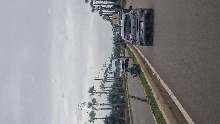 The image displays a multi-lane asphalt road in Douyet, Morocco, under an overcast grey sky. Water droplets are visible on the camera lens or windshield, suggesting precipitation or condensation. A grey hatchback, bearing Moroccan license plate "30364 | 1 | 5", travels in the immediate foreground, moving away from the viewer. Behind it, a darker vehicle is also observed. In the opposing traffic lanes to the left, a white van and multiple other vehicles are visible, heading towards the camera. The road is divided by a central median strip, which contains green vegetation, a series of ornamental black streetlights, and numerous tall palm trees extending into the distance. Additional palm trees are visible lining the right side of the road further into the background. No individuals are discernible within the frame.
