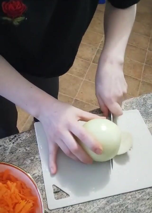 Here's a concise description of the video: A woman is in a kitchen, preparing food. She's wearing a black shirt with a red rose design, gray leggings, and black socks. She cuts the top off a white onion on a white cutting board. Next to the cutting board is a bowl of shredded carrots. She stops to look at the camera, puts on glasses, then walks away from the counter. The kitchen has brown and beige patterned flooring.