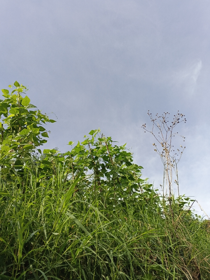 Lush green grass fills the lower portion of the frame, reaching upwards. Behind the grass are leafy green plants and vines climbing on thin stalks. To the right, slender, dry stalks stand taller, topped with delicate seed heads. Above the foliage, a cloudy sky provides a soft, muted backdrop. The scene evokes a sense of wild, overgrown nature.