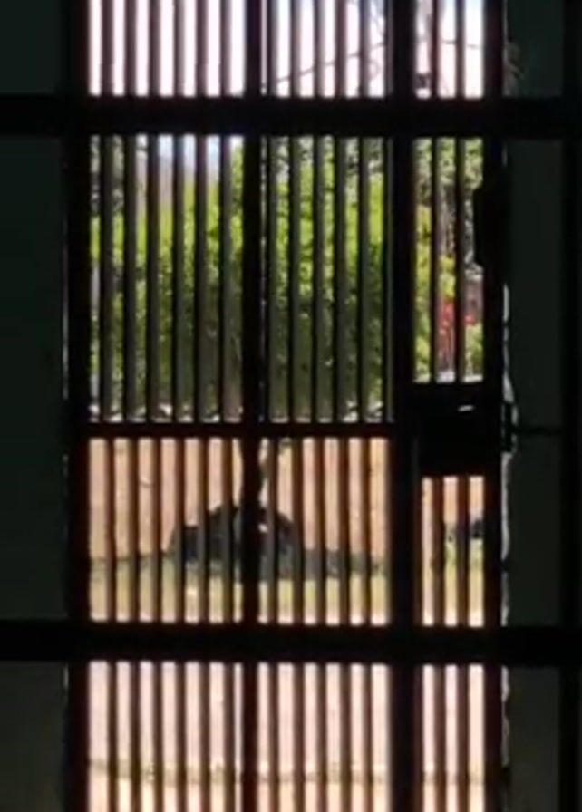 view through a barred gate. The gate has horizontal and vertical bars, creating a grid-like pattern. Outside the gate is an outdoor scene with trees and sunlight. The gate is old and appears to be part of an enclosure or building.