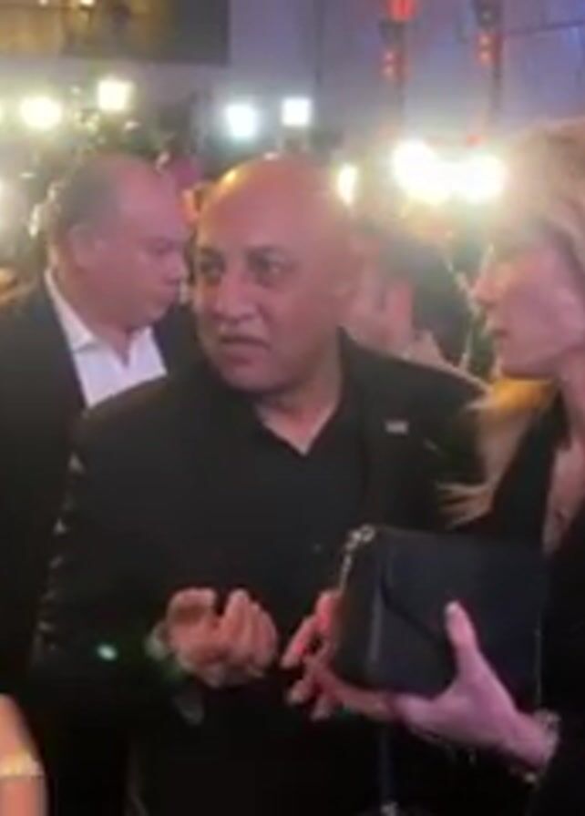 A man in a black blazer gestures with his hands while conversing with two women. He is holding a wine glass with a light-colored liquid. The woman on the left has dark hair and is wearing a black dress with sheer polka dot sleeves. The woman on the right has blonde hair and is wearing a black jacket. They are standing in a crowded indoor space with numerous people in the background, some of whom are holding drinks and wearing wristbands. Overhead lighting is visible. A small U.S. flag pin is affixed to the man's lapel.