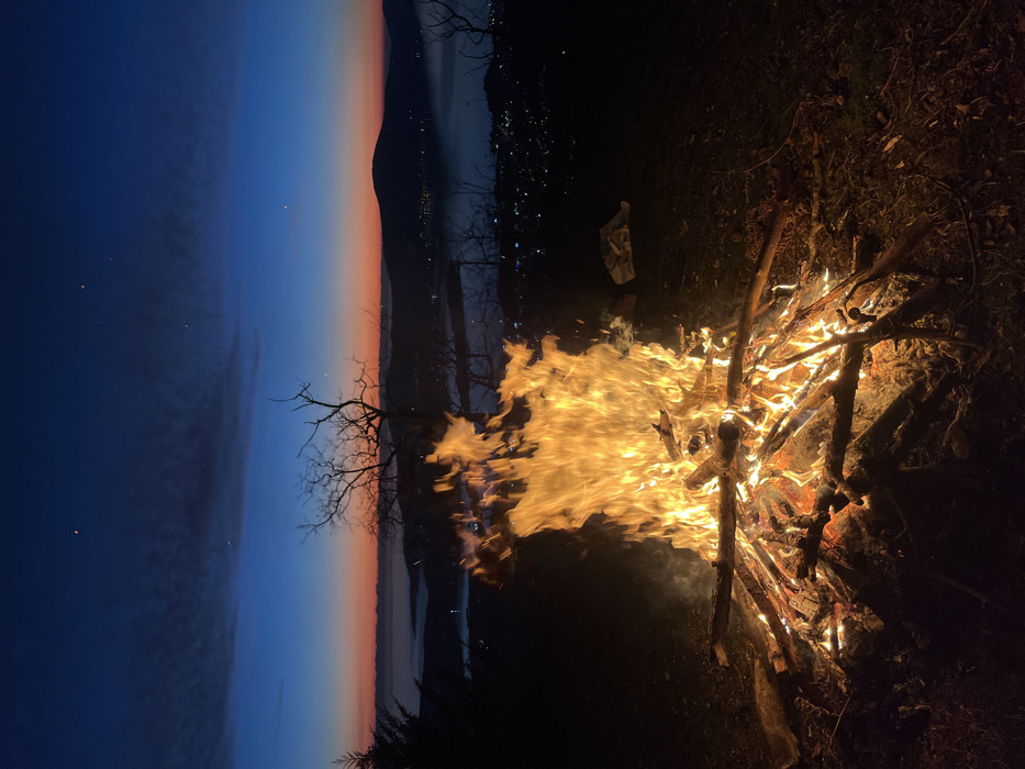 A vibrant campfire blazes with orange flames dominating the right side of the image. A pile of wood fuels the fire, casting light on the surrounding dark ground. A cityscape twinkles in the distance near a body of water. The sky transitions from dark blue to orange at the horizon. A bare tree branch silhouettes against the colorful sky above the lake.