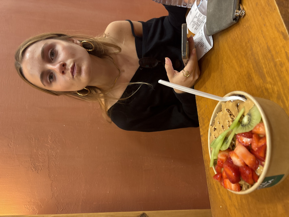 An image taken indoors depicts a young woman seated at a light brown wooden table, looking directly at the camera with pursed lips. She has light brown hair, wears a black off-the-shoulder top, gold hoop earrings, and a gold necklace. Her left hand, adorned with a gold ring, holds a silver smartphone. On the table, in the foreground, is a paper bowl containing a meal topped with sliced strawberries, sliced kiwi, and a tan, granular spread, with a white plastic spoon inserted. To the right of the bowl, near the woman's hand, are a crumpled paper receipt, a dark grey wallet, and a clear plastic water bottle. The background features a solid, textured reddish-brown wall, with a partial vertical wooden beam visible on the far left. The receipt indicates the location as "Rua da Prata 145," corresponding to Casa Galão Brunch & Coffee in Lisbon, Portugal.