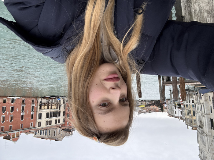 A female individual, appearing in her 20s or 30s, with light brown hair and an orange hair clip, takes a selfie, extending her right arm to hold the camera. She wears a dark blue puffer jacket over a light-colored top. Her gaze is directed at the camera lens. She is positioned on a stone or concrete parapet overlooking the Grand Canal in Venice, Italy, under an overcast sky. In the background, the turquoise-green water of the Grand Canal flows. On the left bank, a series of multi-story historic buildings with light-colored facades (cream, yellow, grey) and traditional tiled roofs line the canal. Several weathered wooden mooring posts stand in the water near the left bank. On the right bank, multi-story historic buildings with predominantly reddish-orange and off-white facades and tiled roofs are visible. Several small boats are moored along the right bank. In the mid-distance, a dark-colored, multi-arched bridge, consistent with the Ponte dell'Accademia, spans the canal, connecting the two opposing banks of buildings.