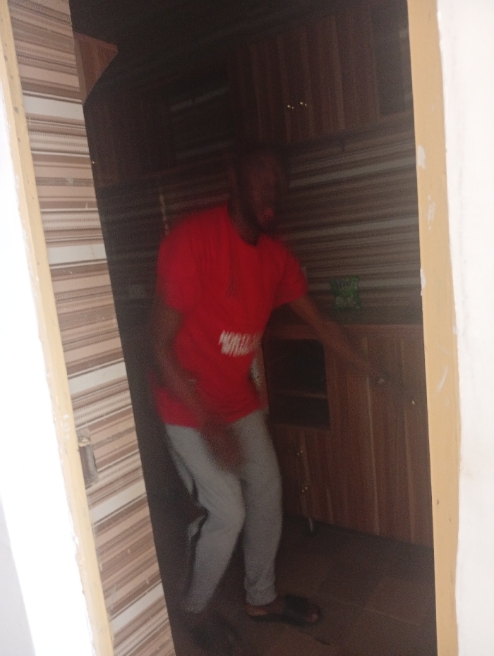 The image depicts an indoor scene in Fagge D2, Nigeria, viewed through a doorway. A dark-skinned male subject, blurred by movement, stands in the central-right area of the frame. He is dressed in a red t-shirt with a white graphic, light grey trousers, and black slide sandals. His right arm is extended forward and downward. The room's visible walls feature horizontal striped wallpaper in light brown and white tones. Wooden cabinetry, including upper and lower units with light-colored handles, lines the back wall. A dark-tiled floor is visible. A green object rests on a lower cabinet shelf. The doorway entrance is framed by a patterned left jamb and a plain light-colored right jamb, with brighter light entering from outside the room.