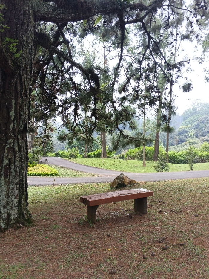 - "A wooden bench sits on a lawn scattered with pine needles under the dense canopy of a large pine tree" by FM-lI7Km1, licensed under CC BY 4.0
