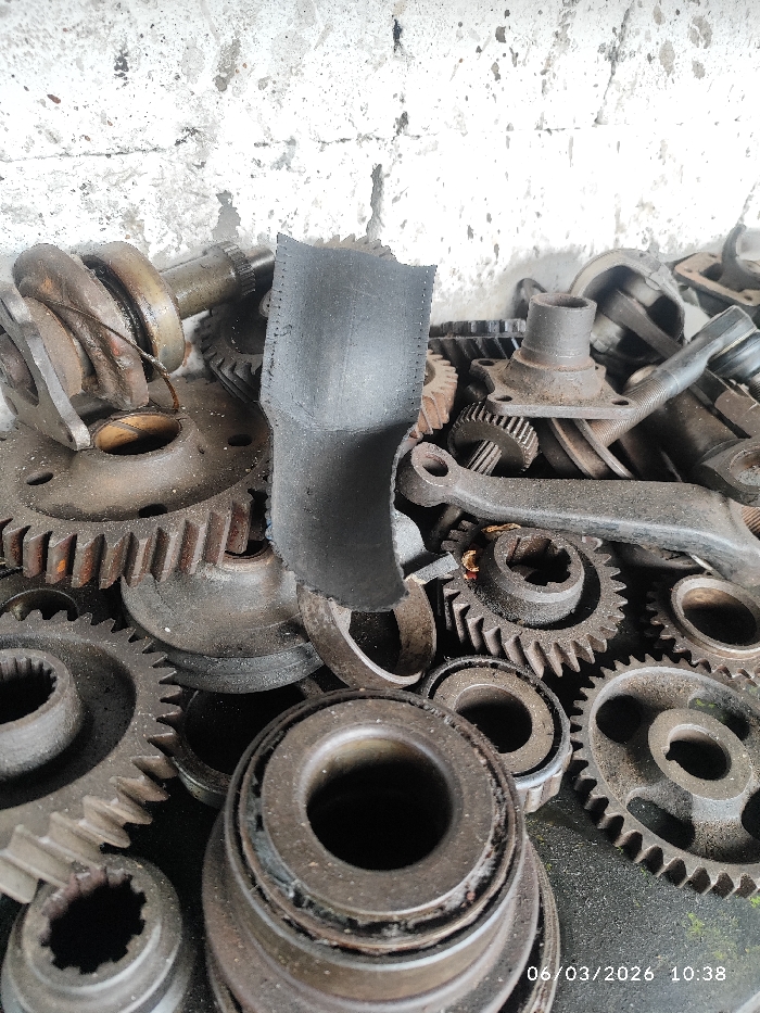 The image depicts a close-up view of a dense accumulation of various discarded or stored mechanical components, predominantly metal, against a dirty, light-colored wall in Tinaquillo, Venezuela. The scene is static, showing no people or active interactions. **Subjects and Objects:** The primary subjects are numerous gears of varying sizes, bearings, shafts, and other unidentifiable rusted and greasy metal parts. A prominent, dark gray, irregularly shaped, torn piece of what appears to be heavy rubber or resilient plastic is vertically situated towards the center-right of the frame, resting among the metal parts. The metal components exhibit significant wear, grime, and oxidation, indicating age and prior use. In the foreground, a stack of cylindrical bearing-like parts is visible, heavily soiled. **Environment:** The background consists of a textured, light-colored wall, possibly concrete or painted masonry, showing significant dirt, stains, and some surface imperfections, suggesting a workshop, garage, or industrial storage setting. The components are piled haphazardly, indicating a state of disuse or temporary storage. **Time and Date:** A digital timestamp in the lower right corner reads "06/03/2026 10:38".