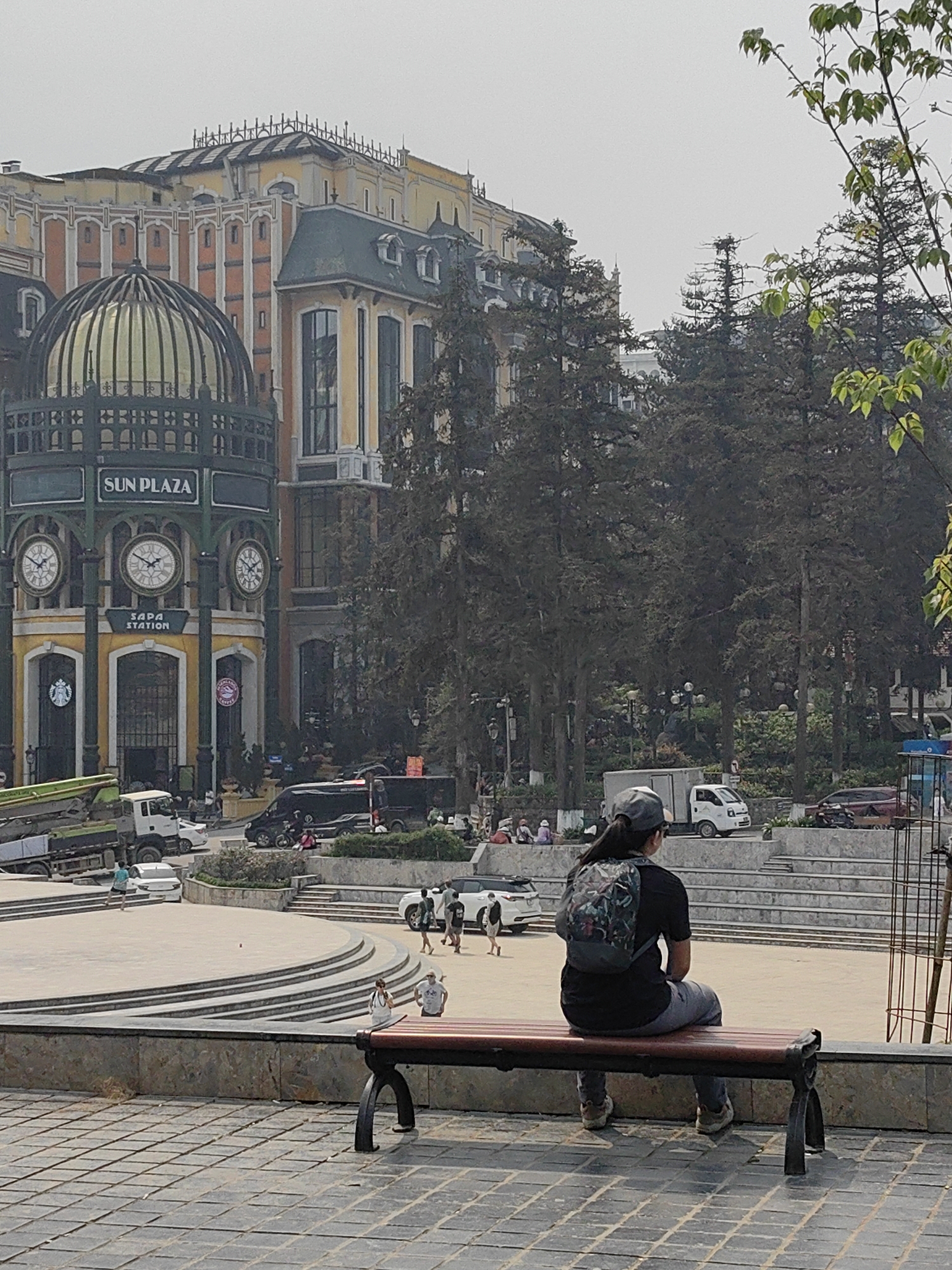 The image depicts an urban scene in Sa Pa, Vietnam, specifically featuring the Sun Plaza building and its surrounding plaza. In the immediate foreground, a person is seated on a dark wooden bench with black metal supports, facing away from the camera, looking towards the plaza and buildings. The individual wears a grey baseball cap, a black t-shirt, grey pants, and light-colored sneakers, with a multi-colored patterned backpack on their back. The ground in the foreground is paved with dark, rectangular tiles. A low concrete retaining wall separates the foreground from a multi-tiered concrete plaza. Several individuals are visible on the plaza: one person in a light blue shirt walks left, a group of two or three people walks right, and others are scattered throughout. Vehicles are present on the roads bordering the plaza, including a white and green flatbed truck on the left, a dark passenger van or bus centrally located, and other cars. People are also observed on motorbikes near the dark van. Dominating the left side of the background is the Sun Plaza building, characterized by a large golden-domed roof with intricate dark metalwork. Its facade features dark green framing over yellow sections, displaying three visible clocks and prominent "SUN PLAZA" and "SAPA STATION" signage. A Starbucks logo and another circular pink logo are visible at ground level. Behind and to the right of Sun Plaza are additional multi-story buildings exhibiting European architectural elements with yellow, orange, and grey facades and ornate rooflines. A dense cluster of dark evergreen trees separates the plaza from some of these background structures. The sky is overcast and grey, indicating a cloudy or hazy daytime condition.