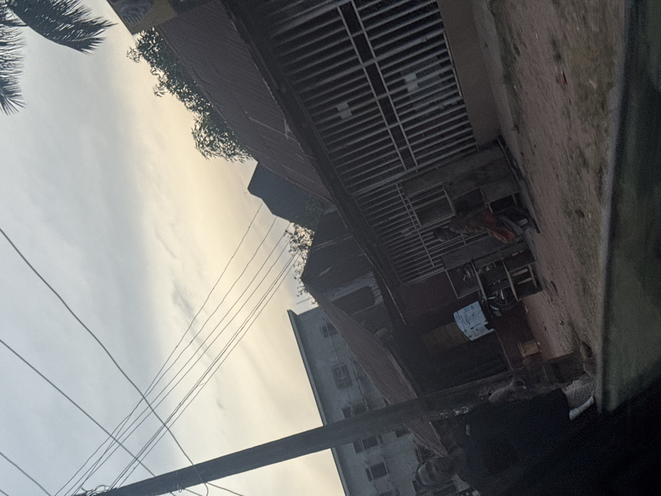 Overhead power lines crisscross the sky against a pale, cloudy backdrop. Dilapidated buildings line a narrow street. The structures appear aged, with visible signs of wear and rust. A vendor stands under a barred awning, surrounded by miscellaneous items and furniture. The overall scene suggests a developing area or a poorer urban setting.