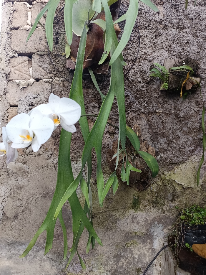 The image displays a textured concrete or stucco wall in Limbangan Sari, Indonesia, adorned with multiple plants. A large staghorn fern (*Platycerium*) is centrally mounted to the wall, featuring a broad, brown basal frond attached to a wooden or coconut husk substrate secured by wire mesh, from which numerous long, green, bifurcated fertile fronds extend downwards. To the mid-left, a cluster of at least three white *Phalaenopsis* orchid flowers, each with a yellow-orange labellum, are in bloom on a stem originating from the left. In the upper-right quadrant, a small-leaved fern is affixed to the wall on a separate brown mount. Another small plant is visible on a similar mount directly below the main staghorn fern. The lower-right shows a black container holding small green foliage plants, with a dark cable or hose partially visible leading towards it. The wall's surface is rough, exhibiting varying shades of grey and brown, with areas of greenish biological growth and underlying brickwork visible in the upper-left. No people are present.
