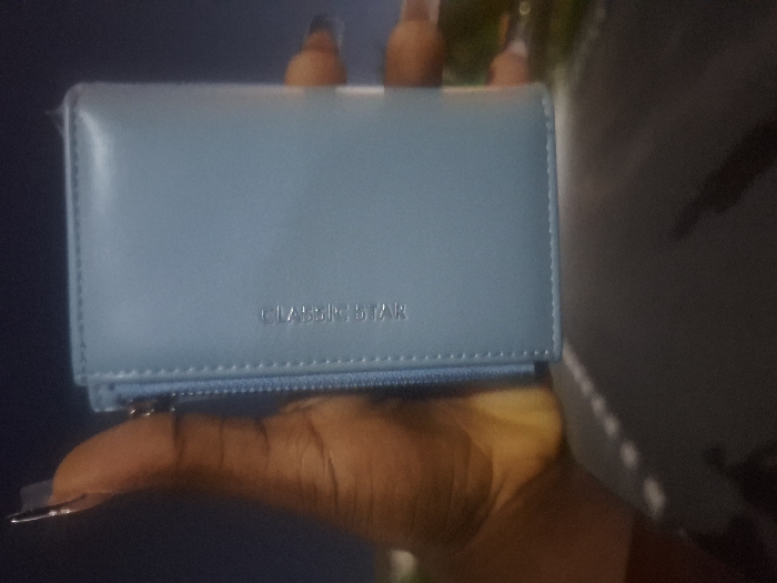 A hand holds a light blue "Classic Star" wallet. The wallet has a zipper along the bottom edge. The hand has long, glossy nails. The background is a mix of dark and light shades, showing a blurry plant.