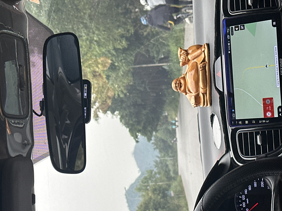 The image depicts a forward view from the interior of a vehicle, looking through the windshield onto a rural road. In the foreground, the upper edge of the dashboard and a portion of the steering wheel are visible. A rearview mirror is mounted centrally at the top of the windshield, with a small dashboard camera affixed beneath it. A wooden figurine of a smiling Buddha (Hotei) holding an item resembling a ruyi scepter and a sack, rests on the center of the dashboard. To the bottom-left, the edge of a black steering wheel and a speedometer cluster are partially visible, indicating a speed of approximately 0 km/h. To the bottom-right, a rectangular digital infotainment or navigation screen displays a map showing a yellow route line and a blue marker. Text on the screen identifies the current location as "Tràng An X. Ninh Xuân, H. Hoa Lư, T. Ninh Bình," indicating Tràng An, Ninh Xuân Commune, Hoa Lư District, Ninh Bình Province, Vietnam. The screen also displays a 50 km/h speed limit sign and the time "15:53". The midground shows a paved road, likely asphalt, extending into the distance with a slight curve to the right. On the right side of the road, two individuals on bicycles are observed moving away from the viewer; one wears a blue helmet and dark clothing, the other a lighter helmet. Further ahead on the left side of the road, two light-colored scooters or motorcycles and one darker motorcycle are visible, also moving away. Dense green trees and foliage line both sides of the road. In the background, hazy green mountains or hills are present under an overcast or hazy sky.
