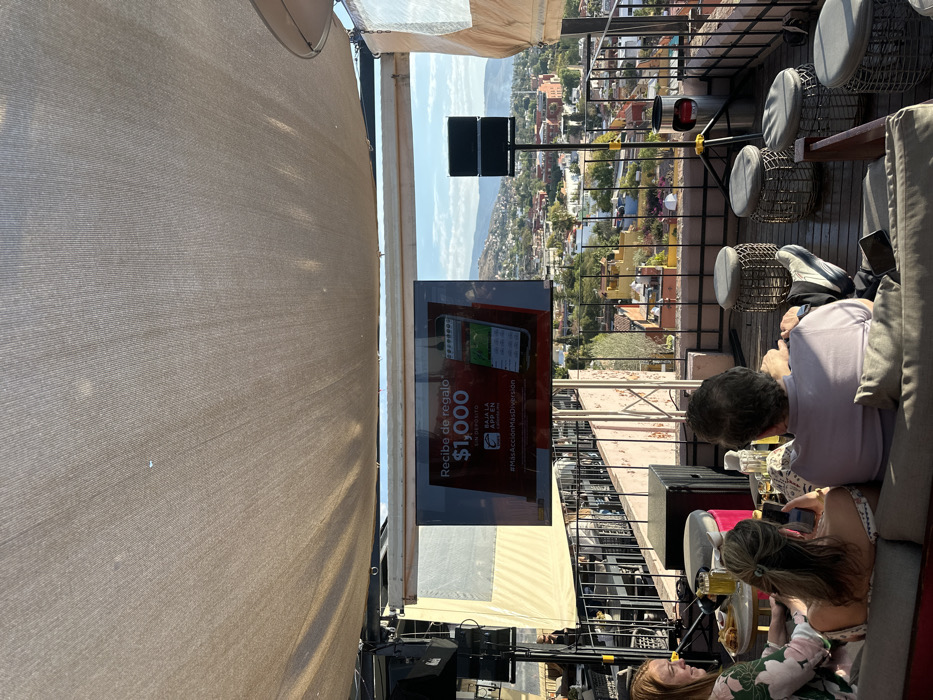 A high-angle shot showcases an outdoor rooftop setting with a panoramic cityscape in the background. Seating arrangements with woven stools and a couch are visible, occupied by people enjoying drinks. A large screen displays an advertisement, and sound equipment indicates potential event hosting. A retractable awning provides partial shade, while the city sprawls in the distance, framed by a metal railing.