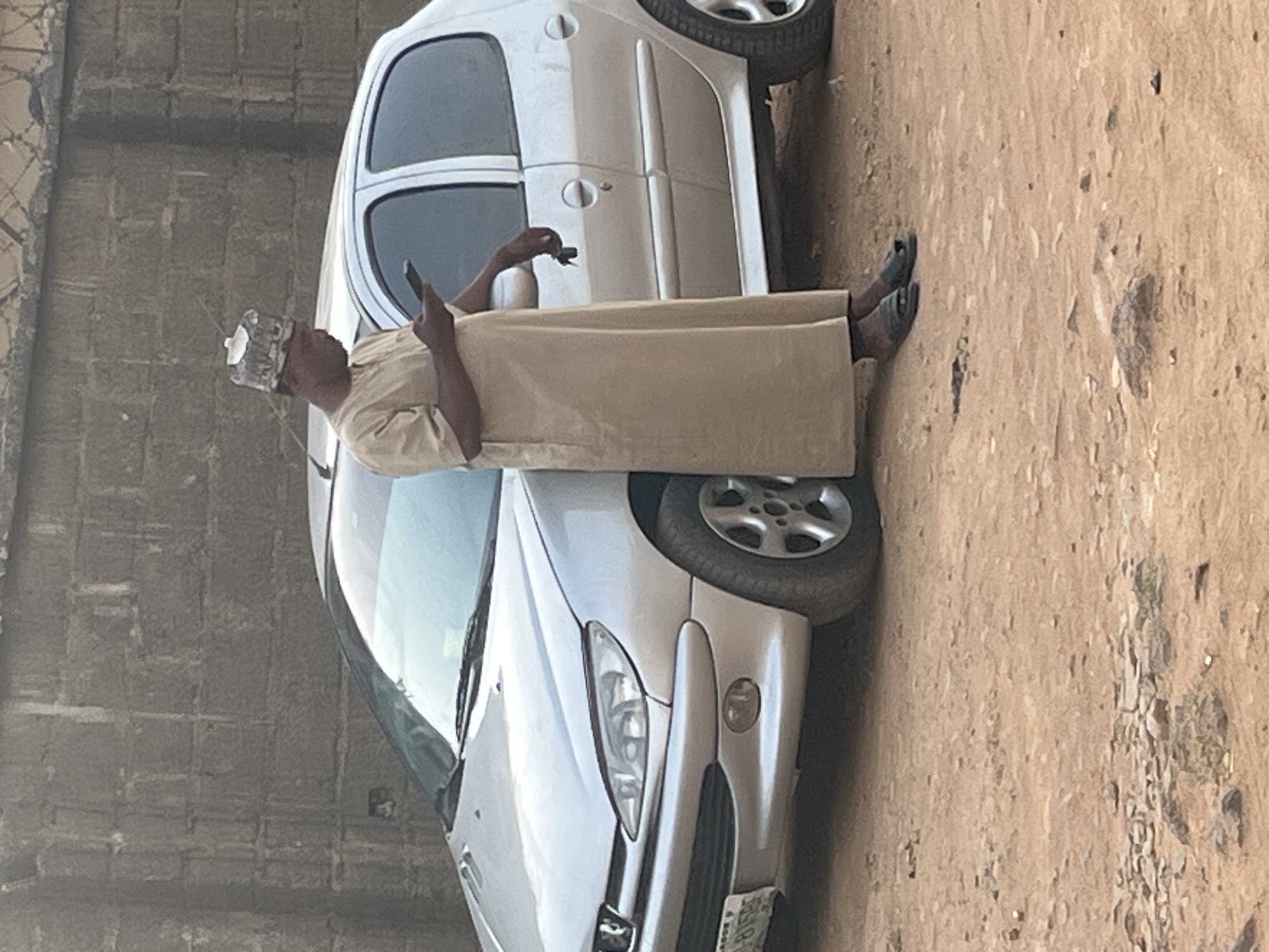 An individual is standing next to a silver Peugeot 206, holding a mobile phone in his right hand and a key in his left. The individual is wearing a tan robe and traditional headwear, and black sandals. The background consists of an exterior wall on the left side, and a sandy or dirt ground on the right. The scene appears to be located outdoors in Rido, Nigeria. The license plate of the car is barely visible.