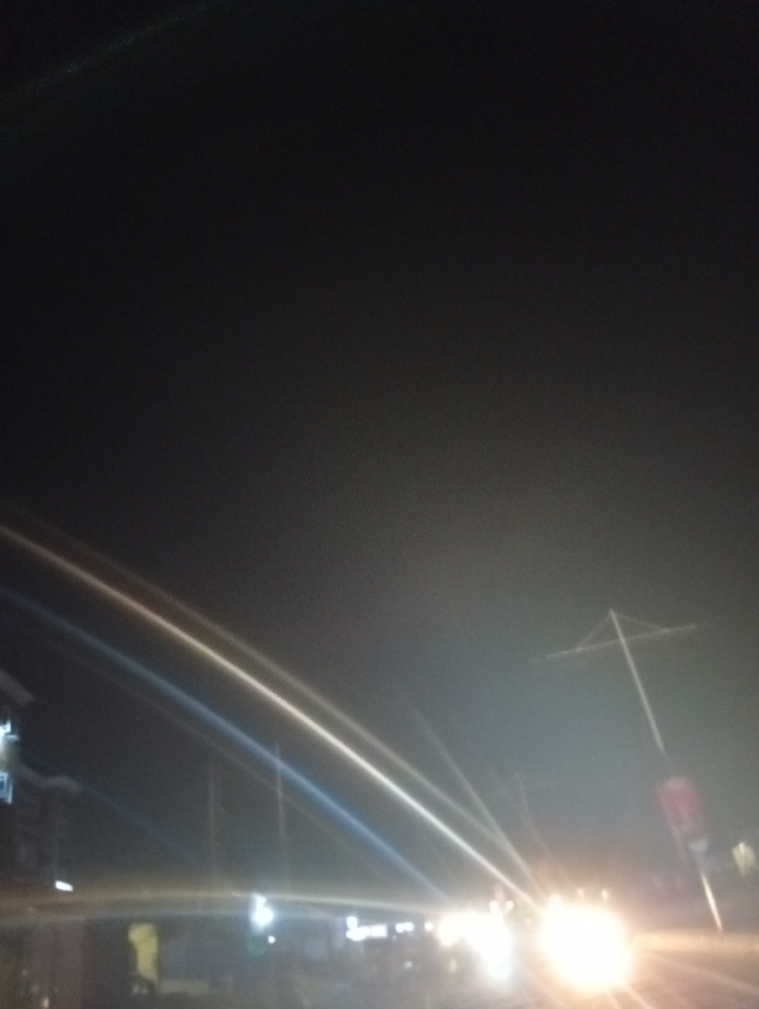 A blurry night scene presents a street with light trails, probably from a moving vehicle's headlights. The lights illuminate the surrounding area, revealing silhouettes of buildings and utility poles. The sky is dark and vast, contributing to the overall low-light ambiance. The image's focus is soft, emphasizing the light sources and creating a sense of motion.