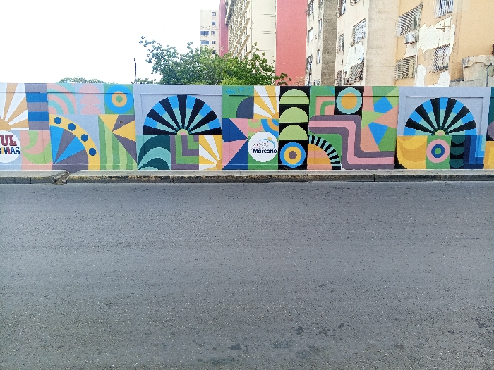 A street mural showcases geometric patterns in various shapes and colors, including fans, circles, and triangles. The vibrant palette features blue, yellow, green, and pink. The mural is painted on a concrete wall along a street. The surface in front of the wall is asphalt and some buildings are in the background. There is a logo on one of the blocks.
