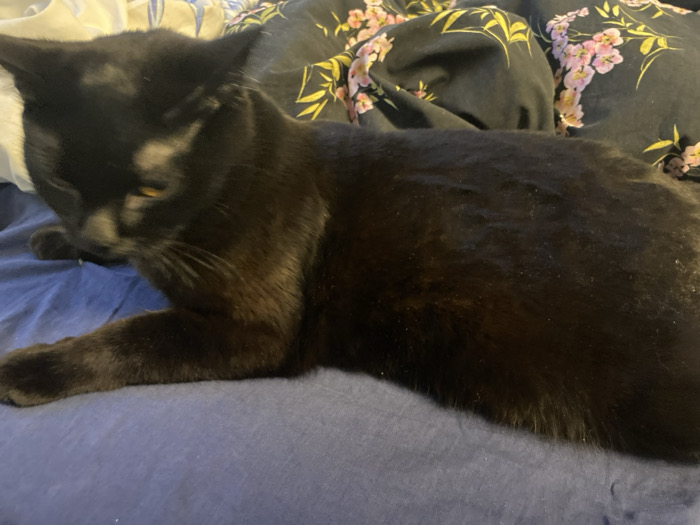 The scene is depicted as occurring in the city of Chaikovsky, Russia. A black domestic cat is observed resting indoors, positioned with its body extending horizontally across the lower and middle portions of the frame. The animal's left eye is visible, displaying an amber hue, while its head is turned slightly to its left. Its ears are erect. The cat is lying on a flat surface covered with a plain blue fabric. Behind the cat, and occupying the upper right portion of the image, is a crumpled dark-colored fabric adorned with a repeating floral pattern featuring pink blossoms and yellow foliage. No other subjects or actions are discernible.