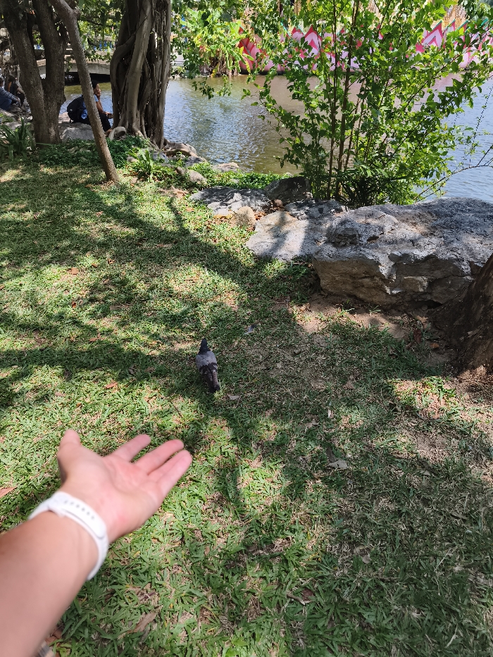 A pigeon stands on a grassy lawn with dappled sunlight. An outstretched hand with a white wristwatch reaches toward the bird. In the background, trees and a body of water are visible, and people are sitting near the water's edge. The scene appears to be a park or garden setting.
