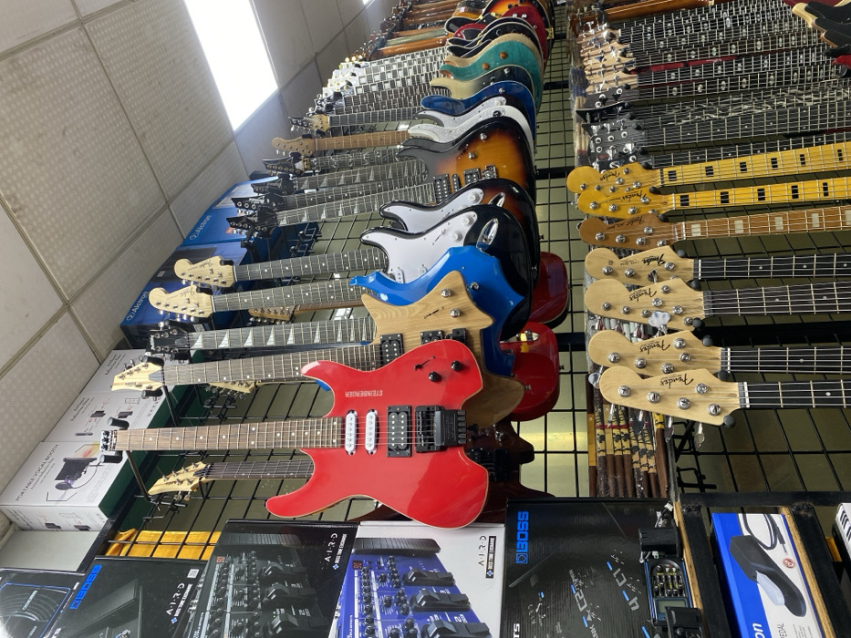 The image displays an interior view of a musical instrument retail store in the Yuexiu District, China. The scene is dominated by a dense arrangement of guitars and related equipment, meticulously displayed for sale. In the upper-mid section of the frame, a horizontal row of approximately 20 electric guitars is suspended vertically from a black grid wall system. The prominent guitar on the far left is a red, headless Steinberger-style electric guitar with a humbucker-single-humbucker pickup configuration and black hardware. To its right, an identical red headless guitar is visible, followed by an assortment of solid-body electric guitars featuring various finishes such as natural wood, blue, white, black, sunburst, and turquoise. Many of these guitars exhibit Fender-style headstocks and diverse pickup configurations, including both single-coil and humbucker types. Below this primary display, a second, partial row of bass guitars is visible, also hung vertically. Several headstocks in this row are clearly branded with the "Fender" logo, indicating Fender or Fender-licensed instruments. These bass guitars feature a variety of neck and body finishes. On the left side of the image, stacked retail boxes are present on shelves. Identifiable packaging includes "BOSS" branded items, a "PORTABLE VOCAL BOOTH," and products from "Aicrton" and "AIR.D," suggesting guitar effects pedals, audio interfaces, or recording equipment. A blue box containing a foot pedal is also situated on a lower shelf. The ceiling features white rectangular acoustic tiles with integrated fluorescent lighting panels, providing bright, uniform illumination throughout the retail space. The environment is organized and appears to be a well-stocked commercial setting. No individuals are present in the depicted scene.