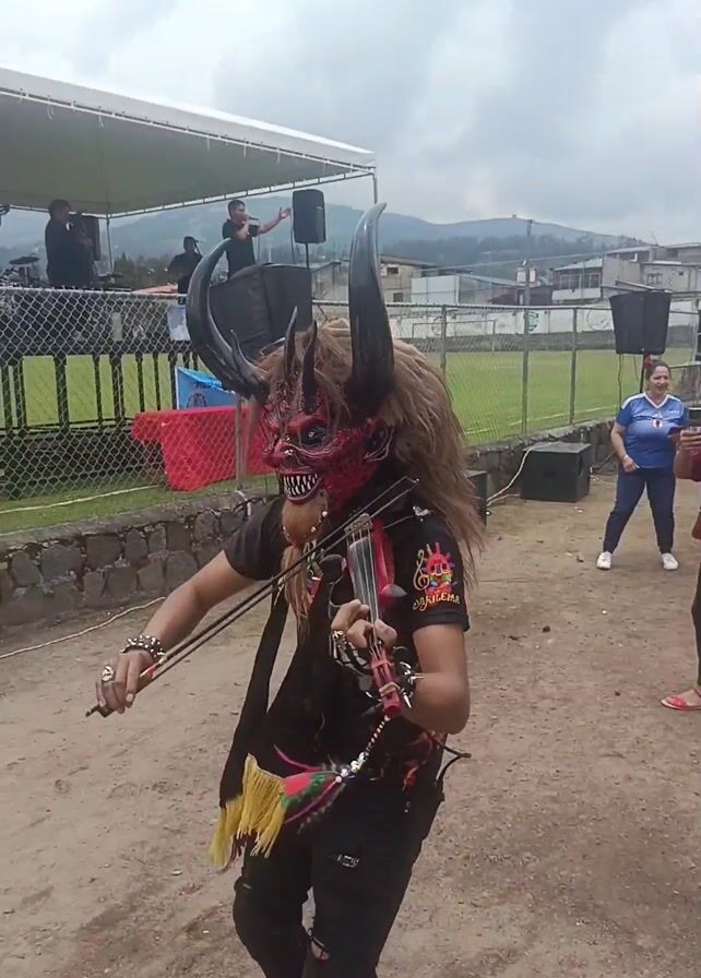 A man wearing a devil mask and playing the violin stands in a dirt area with people milling around him. The mask is red and black with large black horns and visible teeth. The man is wearing a black shirt with colorful designs and black pants. He has beaded accessories hanging from his waist and wrists. Behind him is a fenced-in area with a white tent and a band playing on a small stage. There are speakers and other equipment near the stage. People are standing and walking around in the background, some watching the band. A woman in a blue shirt and a red hair accessory is seen in the background. The sky is overcast. In the distance, there are houses and mountains. The violinist moves around while playing, interacting with people nearby who watch and film him with their phones.