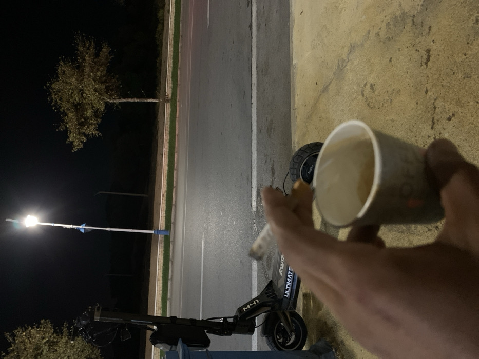 The image captures a nighttime scene in M'diq, Morocco. In the foreground, a human hand holds a lit cigarette with an orange filter and a light brown disposable paper cup containing a light brown liquid, with a visible "OFF" logo. A black electric scooter, branded "M4i" and "ULTIMATE" with thick tires, is parked vertically in the midground, leaning against a blue and white pole. Behind the scooter is an asphalt road with a white dashed lane marking, bordered by a concrete curb and a low stone wall with minimal vegetation. In the background, a tall, illuminated streetlamp with a white and blue pole provides light to the area. Two trees with green foliage are visible along the roadside. The distant background is dark and indistinct.