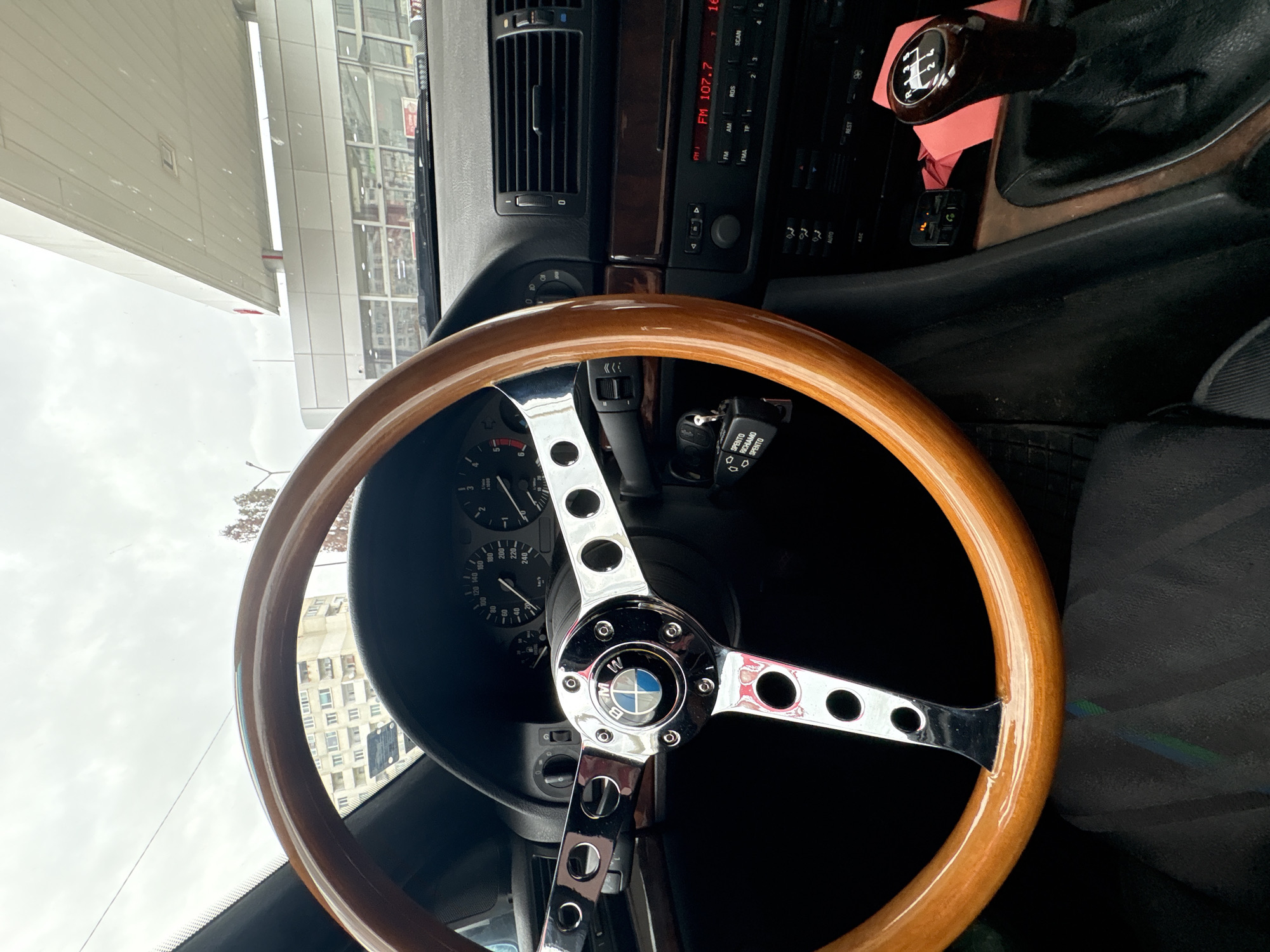Here is a description of the image: The image shows the interior of a car, specifically the dashboard, steering wheel, and surrounding area. The steering wheel is a wooden-rimmed aftermarket wheel with a chrome center. The car is a BMW, indicated by the logo on the steering wheel. The car's radio is displaying "FM 107.7" with the dashboard appearing to be of an older model BMW. The gear stick is visible to the right of the radio. Through the windshield, there is a view of buildings, providing context about the location. Based on the style of the buildings, the location is likely in Sofia, Bulgaria, more specifically, Mladost 3.