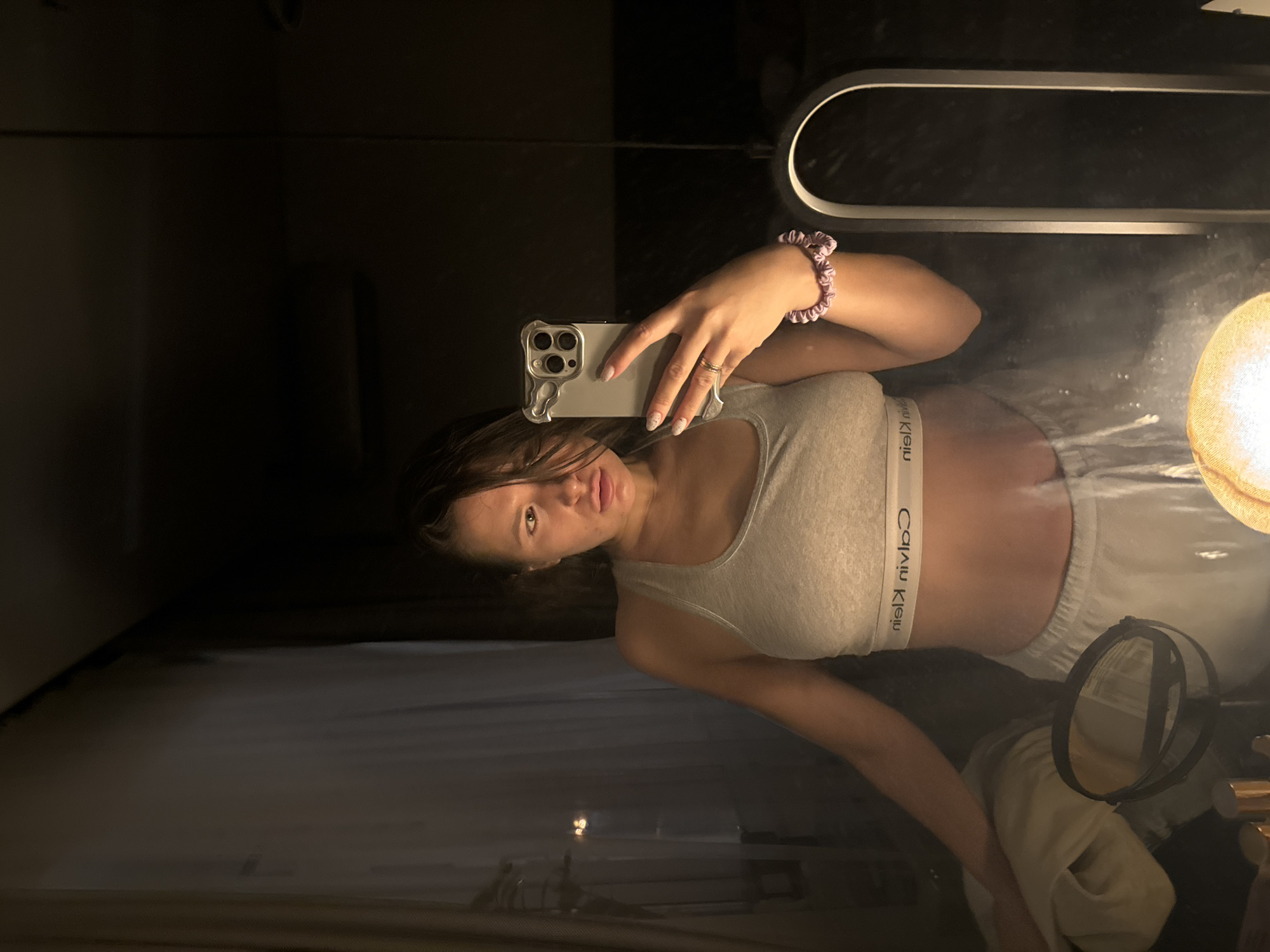 An adult female individual is depicted indoors, taking a mirror selfie. The location is specified as Vnukovo, Russia. The subject is positioned directly in front of a large mirror, holding a light-colored smartphone with a silver-grey protective case in her extended left hand. She is wearing a grey sports bra with the reversed "Calvin Klein" logo visible on the band and light-colored bottoms. Her left hand displays a gold-colored ring on the ring finger and a light purple ruffled scrunchie or bracelet on the wrist; her fingernails feature light-colored polish with subtle patterns. Her dark hair is partially wet or styled to fall over her right eye, and her facial expression is neutral. The immediate environment, reflected in the mirror, is dimly lit, with a dominant light source from below the frame illuminating the subject. To the left of the reflection, light-colored pleated curtains are visible. To the right, a dark, glossy wall or surface is present, with an illuminated arched fixture partially visible towards the bottom. In the foreground of the reflection, a black-framed magnifying mirror and multiple small cosmetic bottles are arranged on a surface, adjacent to another prominent light source.