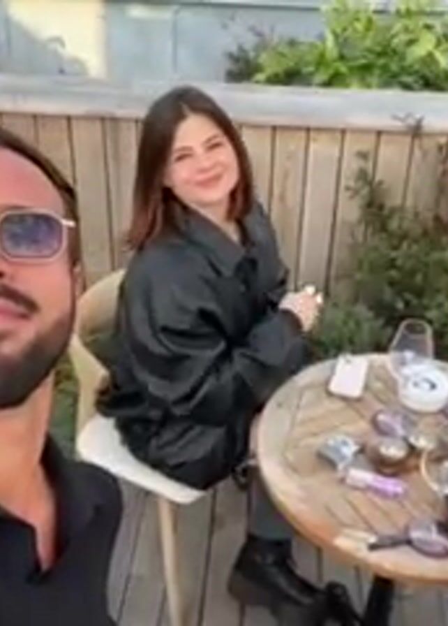The video opens with a selfie of a man with a beard, wearing sunglasses and a black shirt. Seated behind him are two women. The woman on the left wears a black jacket, while the woman on the right wears sunglasses and a dark top with a colorful necklace. They sit at a round wooden table with wine glasses, a small container, and a lighter. The scene is a rooftop terrace with wooden decking and planters filled with greenery and flowers. As the camera pans up and to the left, it reveals a wide cityscape. Dominating the view are ornate buildings, including a prominent tower, against a backdrop of a partly cloudy sky.