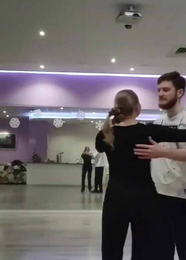 In a well-lit dance studio, a man and a woman are dancing. The woman has her hair in a ponytail and wears a black, long-sleeved top and black pants. The man has a beard and is wearing a white, long-sleeved shirt with black details and black pants. They are facing each other, holding hands and moving in a synchronized manner, with the woman occasionally raising one arm. The studio has a large mirror along one wall, reflecting the dancers and a man standing near a counter in the background. The walls are painted white with a strip of purple trim near the ceiling. Decorations resembling snowflakes are visible on the mirror. The floor is smooth and gray, and there is a projector attached to the ceiling. A couch and other furnishings are also visible in the background. Upbeat music plays as they dance.