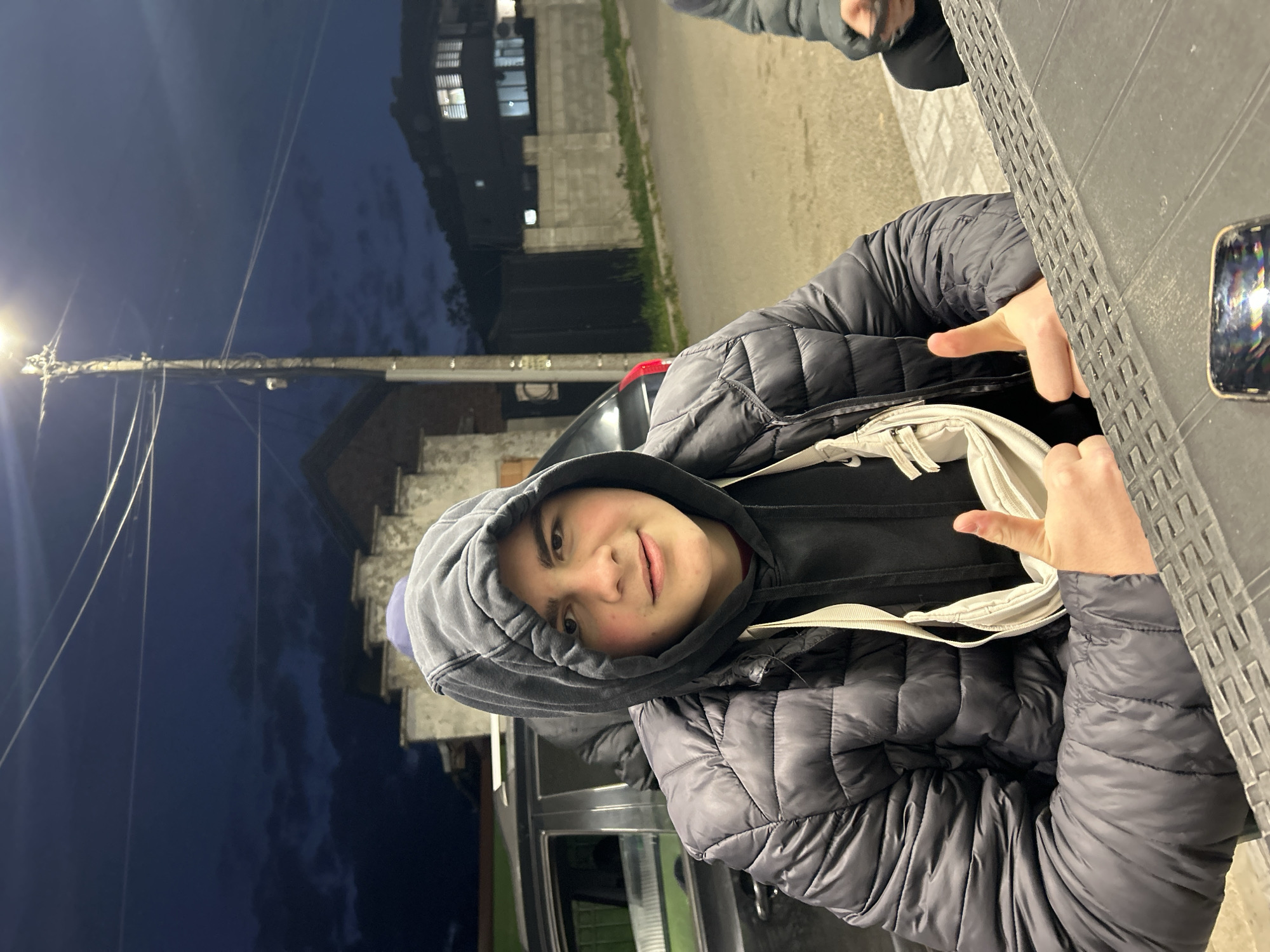 A young individual with fair skin and rosy cheeks, wearing a puffy dark gray jacket with the hood up, is positioned at the center of the frame. They are making hand gestures toward the viewer. A white bag is slung over the shoulder beneath the jacket. A section of a dark-colored table, with a distinct textured pattern, is partially visible on the right edge of the image. A mobile phone is also placed on the table. In the background, a street scene unfolds under the dim light of a street lamp. A building is present, with lights visible in some windows. The image was taken in Goritsa, Bulgaria.