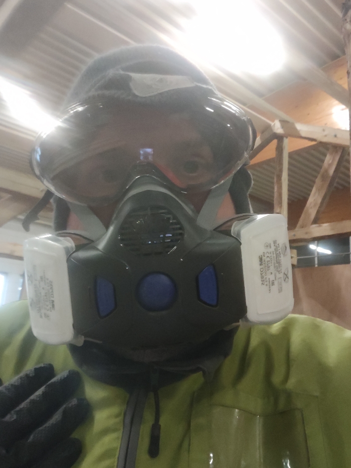 A lone individual is depicted in a close-up, low-angle indoor shot. The subject wears extensive personal protective equipment, including a dark head covering (possibly a beanie), clear wrap-around safety goggles, and a dark grey or black half-mask respirator. The respirator features a central blue circular component, two blue vertical accents, and two white rectangular filter cartridges attached to the sides. Text on the right filter cartridge indicates "3M D3932" and other safety standard markings, suggesting a P3-equivalent particulate or multi-gas filter. The individual wears a high-visibility lime green or yellow work jacket with a dark grey inner collar and a visible clear plastic pocket or patch on the right side. A dark, textured work glove is partially visible on the subject's left hand. The background consists of an interior space with exposed wooden structural beams and a corrugated ceiling or roof material. Multiple bright light sources overhead cause significant glare and reflections on the goggles. The precise location within the city of Leudelange, Luxembourg, is not discernible from the visual information provided in the image.
