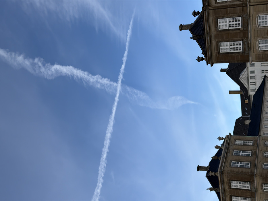 The image depicts an upward view of a clear, light blue sky above Amalienborg Square in Copenhagen, Denmark, framed by the upper sections and rooftops of historical palace buildings. In the sky, two prominent white airplane contrails intersect at an acute angle in the upper-center, forming a distinct "X" pattern. A third, thinner, and somewhat wavy contrail descends vertically from the upper-center, partially overlapping the "X" before dissipating downwards. The lower portion of the frame is occupied by architectural elements. On the left, a multi-story building with a light brown, possibly sandstone or stucco, facade is visible, featuring multiple rectangular windows with white frames. Its dark, likely tiled, roof is topped with a chimney and decorative finials along the cornice. A similar building occupies the lower-right, presenting a corner view with a light brown facade, white-framed windows, a dark tiled roof, multiple chimneys, and ornate decorative elements. In the mid-ground, between these two structures, additional buildings with dark roofs and lighter facades, including a prominent white building with a distinctive gable, are partially visible. No people or moving objects are present.