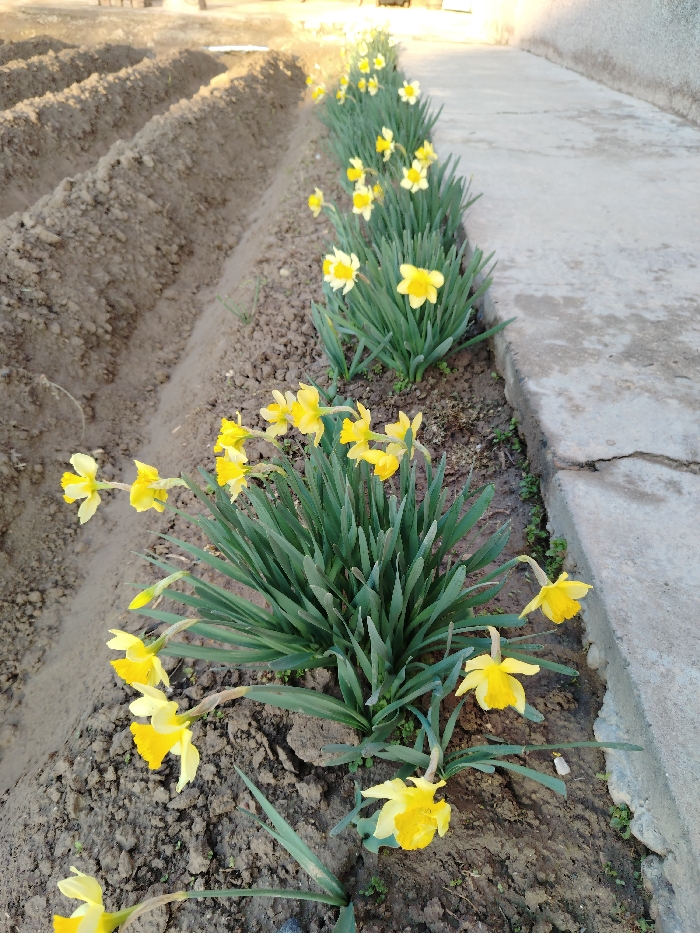 The image displays an outdoor scene in Beshbola, Uzbekistan, featuring a cultivated garden area under clear daylight conditions. A linear bed of blooming yellow daffodils (Narcissus) runs diagonally through the center of the frame, from the lower left towards the upper right. Approximately 20-30 individual daffodil plants are visible, each bearing multiple yellow flowers with distinct trumpet-shaped coronas and paler yellow or cream perianth segments. The daffodils are rooted in dark, moist soil. To the immediate left of the daffodil bed, multiple parallel, raised furrows of tilled dark brown earth are present, suggesting agricultural preparation or planting rows. To the immediate right of the daffodil bed, a light grey concrete or stone pathway extends into the distance, exhibiting minor cracks and wear. The background is slightly out of focus, showing distant ground or structures under direct illumination. No people or animals are present.