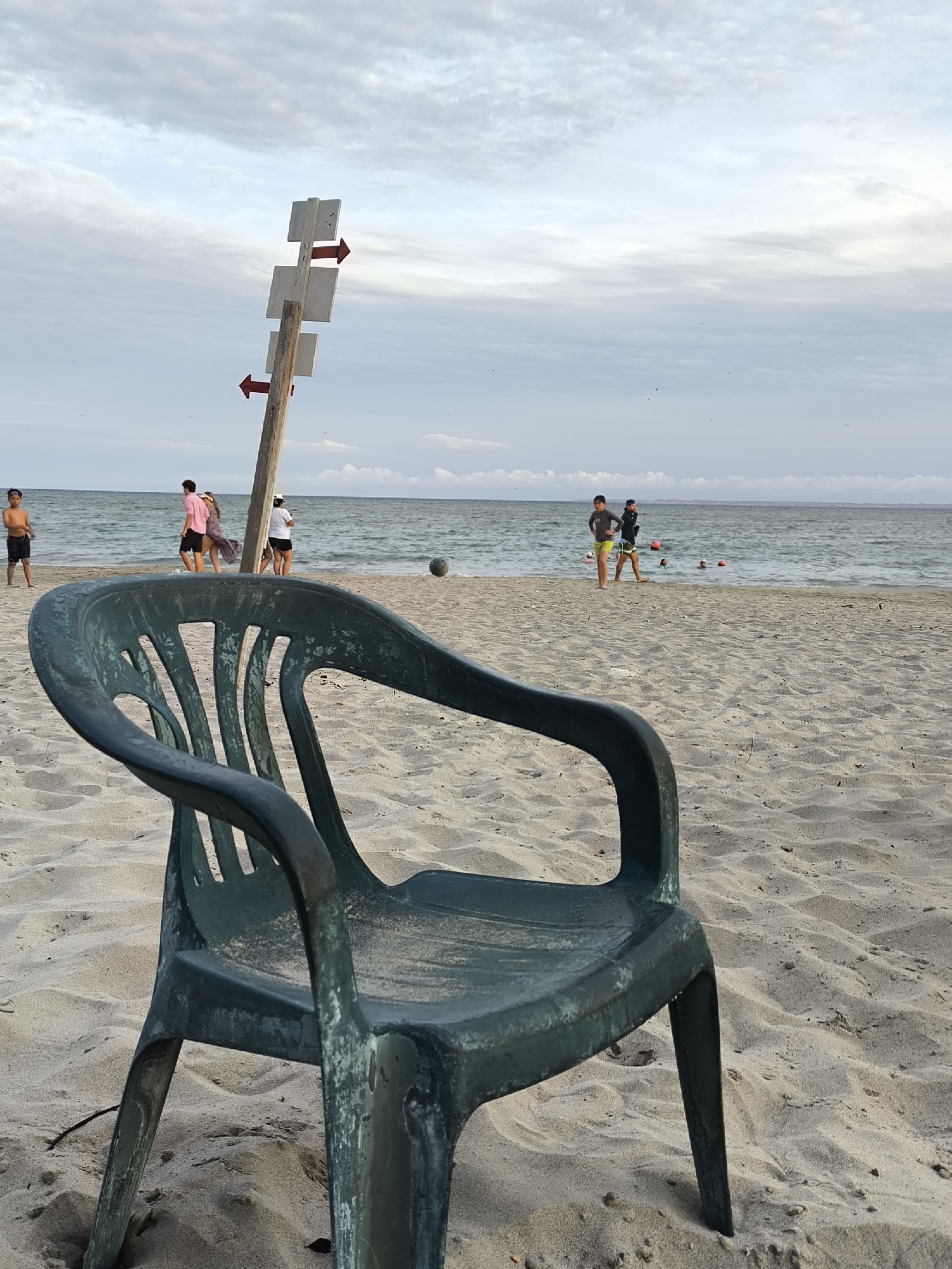 This image captures a scene on a beach at El Yaque, Venezuela. In the foreground, an aged, green plastic chair sits on the sand. Behind the chair, a tall wooden post supports a directional sign with red arrows pointing left and right. The beach stretches into the background, with people scattered along the shoreline, some near the water's edge. A ball is visible on the sand to the left of the sign. The sea meets the horizon under a cloudy sky.
