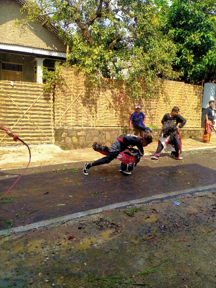 The image depicts an outdoor scene in Kerjo, Indonesia, during daylight. In the foreground, two male individuals are engaged in what appears to be a cultural performance on a paved road. The individual on the left is positioned with his torso parallel to the ground, supported by a red and white patterned drum (kendang) on which his chest is resting. He wears a dark long-sleeved shirt, dark pants with patterned lower legs, and dark athletic shoes. His left arm is extended forward, and his hair is dark and curly. To his right, another male individual is crouched in a low stance, facing towards the first performer. He wears a dark long-sleeved shirt, dark pants, and red-soled athletic shoes, also with dark, curly hair. From the far left, a hand extends into the frame, holding a red-tipped, whip-like object. The road surface shows wear, dirt, and wet patches, along with scattered green foliage and possibly flower petals. In the mid-ground, a stone retaining wall is visible, topped by a light-colored woven bamboo fence, which features an X-pattern design. Behind the fence, a residential house with a corrugated roof, white pillars, and a wooden door is partially visible on the left. Lush green trees and foliage line the background. Several individuals are observing the performance from the mid-ground: one male in a blue patterned shirt and white cap is seated on the stone wall; another male in a dark long-sleeved shirt stands further right; and a third male, partially visible on the far right, wears a dark t-shirt and a patterned sarong-like garment. The scene is illuminated by direct sunlight.