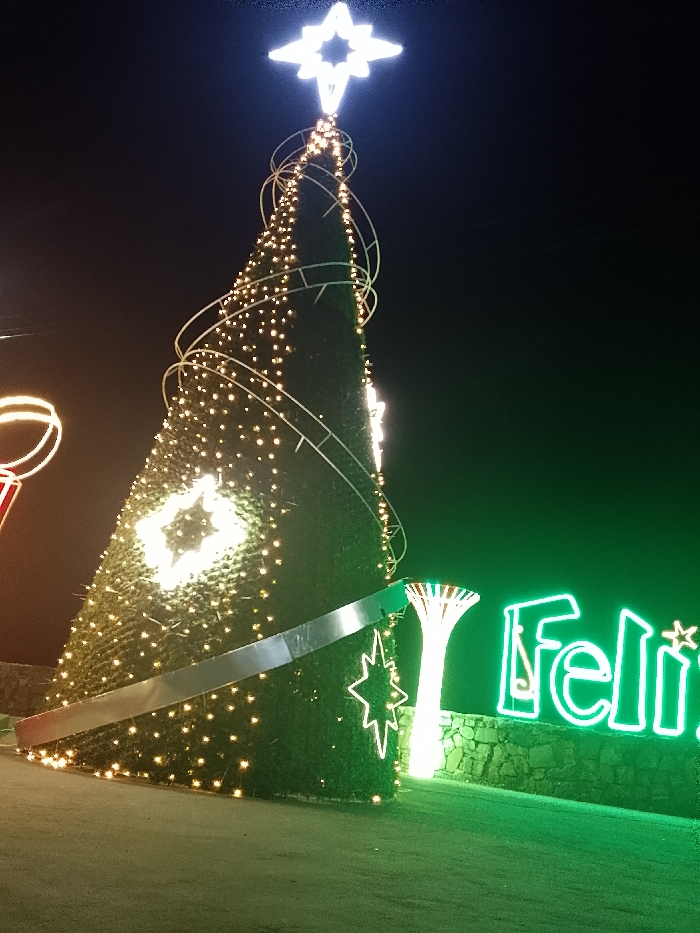 A brightly lit Christmas tree stands tall against a dark night sky, topped with a star. Spiraling metal bands encircle the tree, adorned with small lights. A large, illuminated star sits on the tree's side, above a broad, angled metal band. Nearby, green neon letters spell out "Feliz," accompanied by a star. The scene is a festive display, likely for the holiday season.