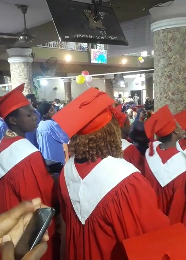 group of people wearing red graduation gowns and mortarboards in what appears to be a church. The person filming is standing behind the group. There are many people seated in the pews of the church. There is a large TV screen suspended from the ceiling. The sound of music and singing is audible.