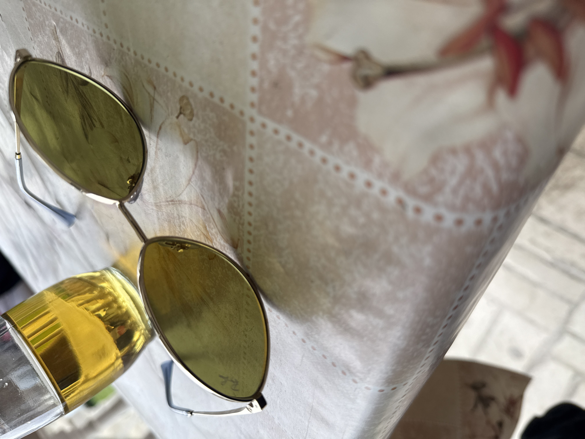 The scene, located in Zlatna Panega, Bulgaria, depicts a clear glass containing an amber-colored liquid and a pair of sunglasses resting on a patterned surface. The glass is approximately two-thirds full of the translucent beverage. The sunglasses feature thin metallic frames with yellow-green tinted, oval-shaped lenses. The "Ray-Ban" logo is faintly visible on the left lens, which also exhibits minor smudging. One temple of the sunglasses is light blue. The objects rest on a light-colored surface, likely a tablecloth, characterized by a grid pattern of small dotted lines and subtle floral or vine-like motifs in muted pink and brown tones. No individuals are present, and no actions or interactions are depicted with the objects. The background, out of focus, suggests an outdoor or semi-outdoor environment, possibly a paved area, visible beneath the edge of the surface.