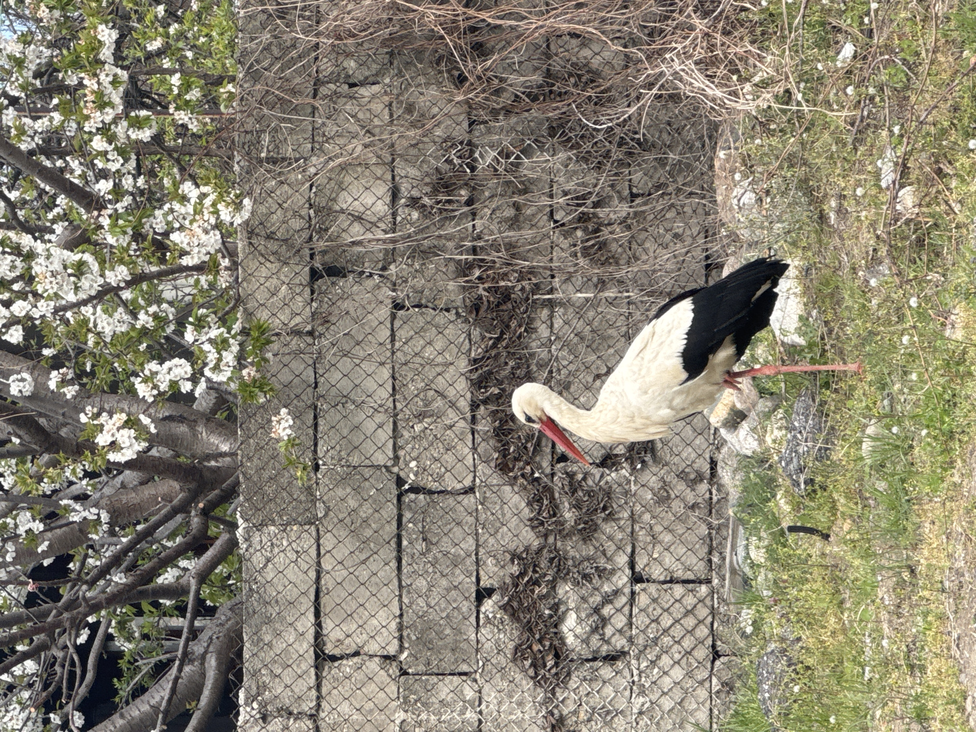 - "A white stork stands on a concrete retaining wall overgrown with vines in the village of Porominovo, Bulgaria" by FM-k4myA2, licensed under CC BY 4.0