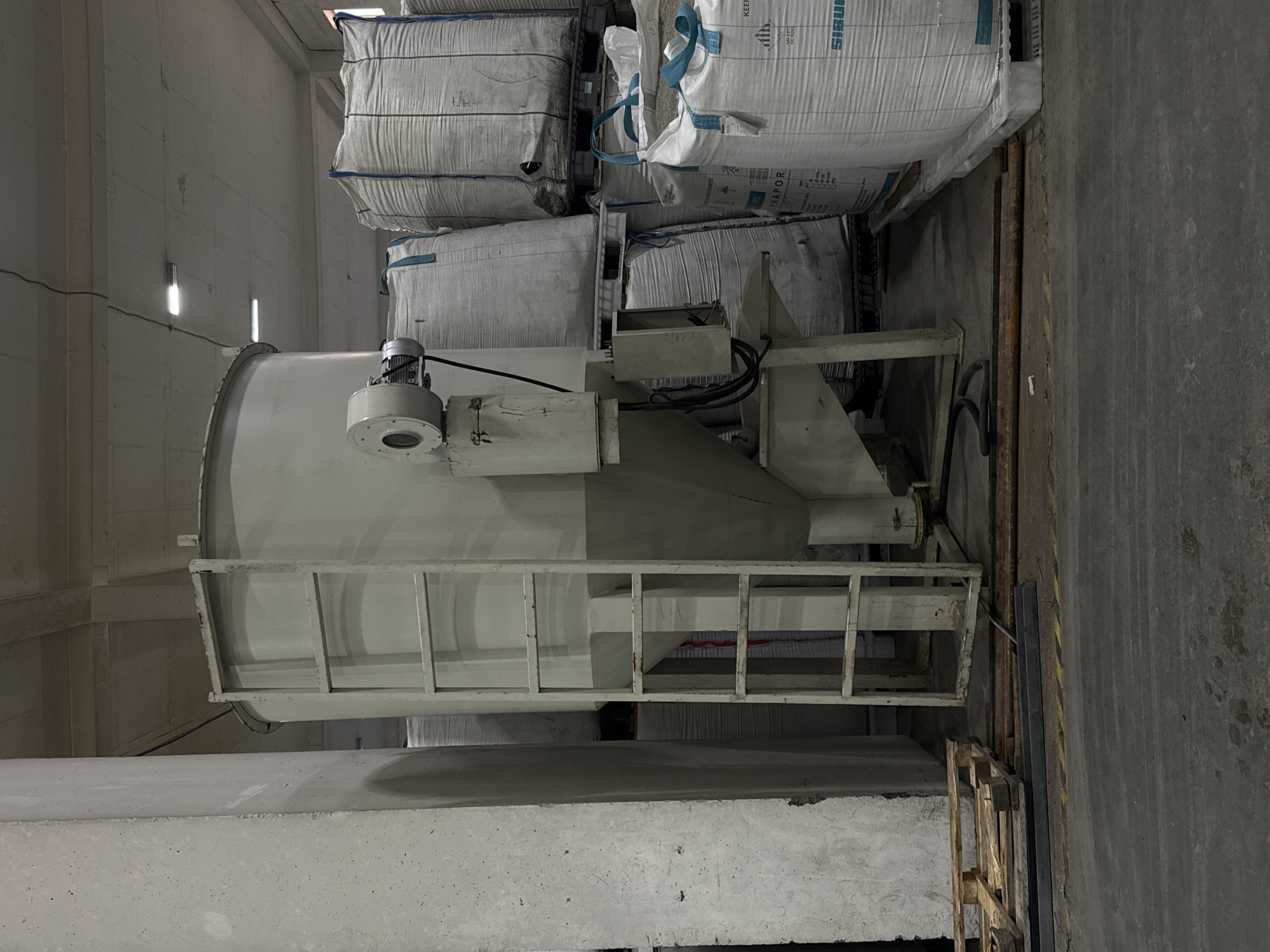 The photograph shows an industrial interior, potentially located in Perm, Russia, given the user's prompt. The scene appears to be a warehouse or storage area with large bags of materials stacked high, possibly containing dry goods. A prominent feature of the image is a large, white, metal machine, which looks like a hopper or mixing device. It has a conical or funnel-shaped upper section, supported by a metal framework. A motor and control panel are attached to the machine. Below the machine, there is a concrete structure or barrier. The environment looks like an industrial setting with concrete walls and floors. There are metal support structures and possibly pallets nearby. The lighting is provided by overhead fluorescent or LED fixtures.